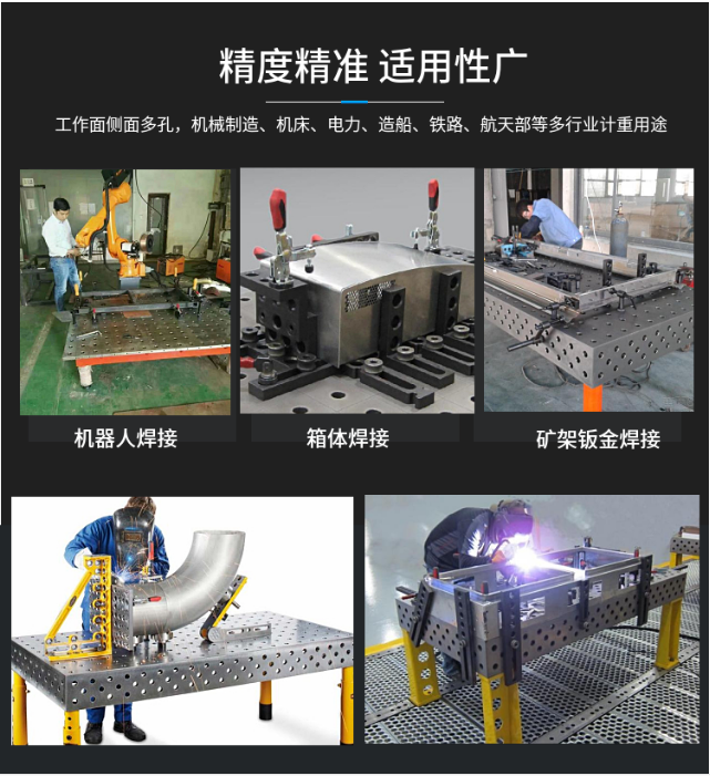 2、柔性化:承載能力高,鋼性穩定,它的五個面均加工有規則的孔,并刻有網線。焊接平臺可方便地延伸和擴展,組合。經擴展的標準臺面可模塊化的定位和夾緊直接連接在一起。在安裝、調整和定位工件過程將柔性三維組合焊接工裝系統的通用功能展示的淋漓盡致,尤其在了大型工件方面的應用上。