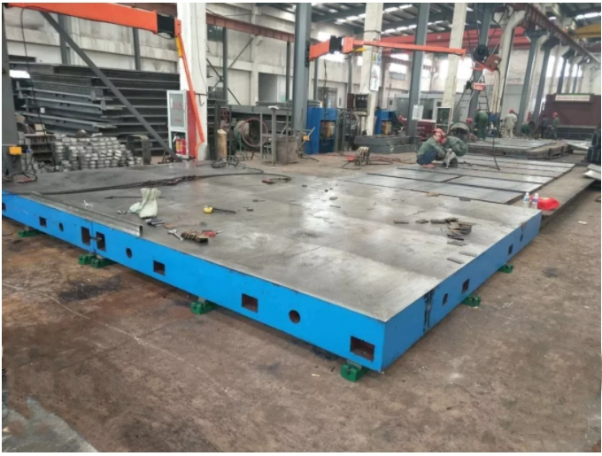 鉚焊平臺用于鉚焊工藝的基礎(chǔ)平板,工作面上有孔和T型槽,孔主要用來清理鉚焊時的一些鐵渣和焊接廢棄物,T型槽主要是用來固定焊接件。